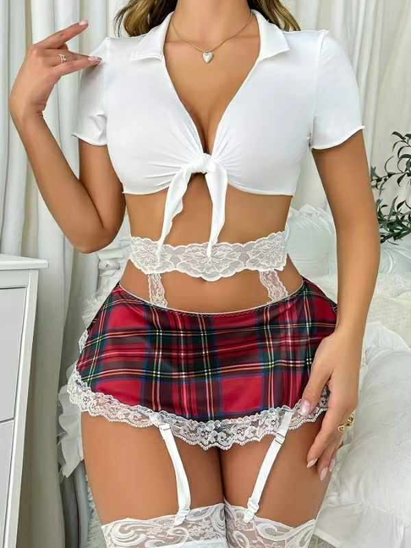 Osez le charme irrésistible de notre ensemble "École Séduction", une lingerie inspirée des looks espiègles et audacieux. Ce modèle deux pièces ultra féminin combine une mini-jupe à carreaux rouges façon tartan, bordée de dentelle blanche raffinée, avec un haut blanc noué à l'avant qui met en valeur le décolleté.